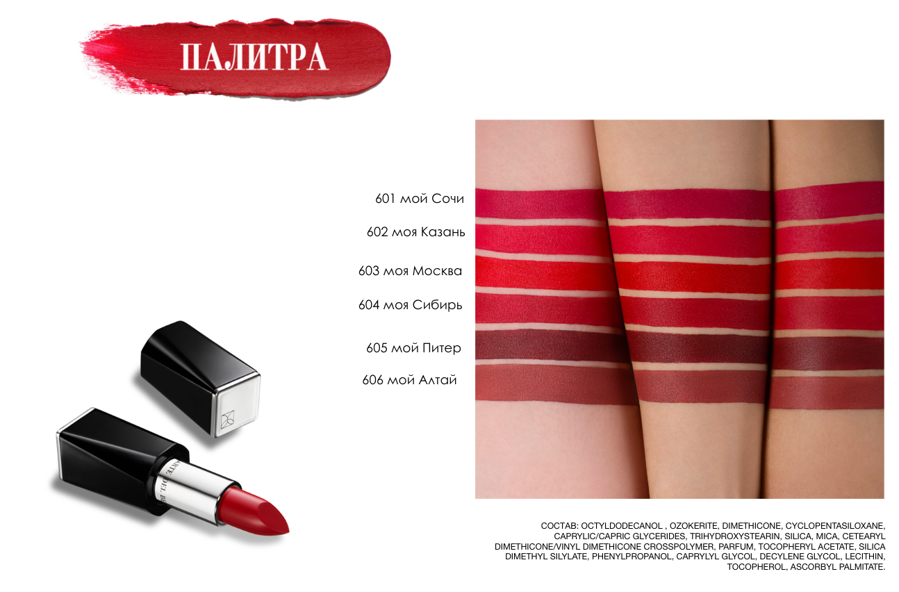 Новая линейка помад Matrёshka создана специально для России как дань ее традициям и современным тенденциям. Шесть ярких и смелых оттенков раскрывают характер и настроение, мгновенно находя отклик. Цвета названы в честь городов и территорий России, так что каждый найдет «свой», идеально подходящий ему по цвету и по духу. Формула помады разработана в Италии с применением передовых технологий и учетом актуальных бьюти-трендов.