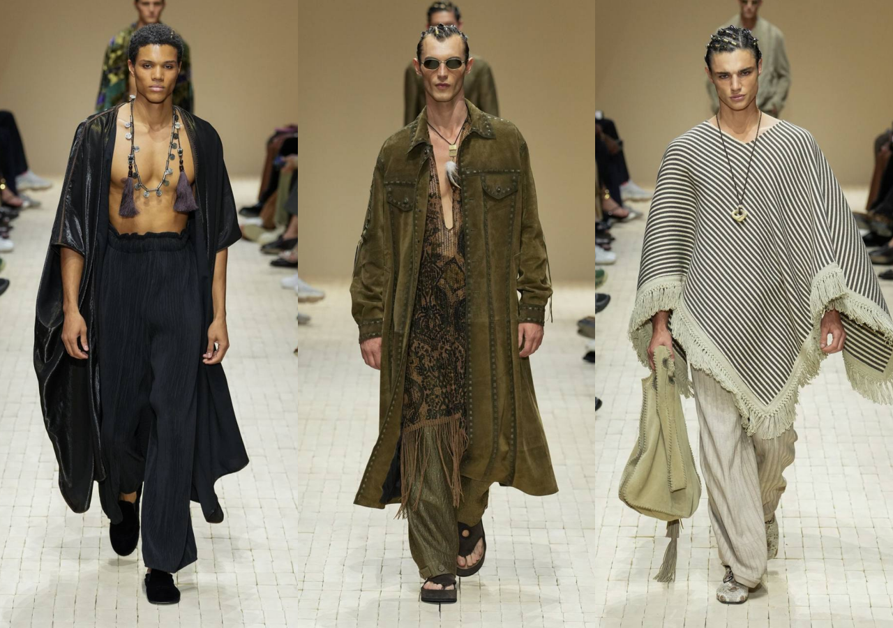 Этнические акценты в коллекции проявляются через: Кисточки на жилетках и жакетах; Сумки-мешки с этническими узорами; Чемоданные сумки с декоративными элементами; Длинные бусы и ожерелья; Перья в украшениях; Соломенные шляпы как завершающий акцент. Общая эстетика коллекции отражает идею комфорта в жарком климате, при этом сохраняя элегантность и современный взгляд на мужской костюм. Сочетание традиционных элементов с современными силуэтами создаёт уникальный образ.