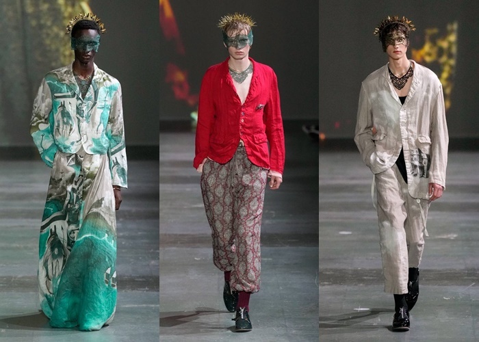 Комплекты включали широкие льняные рубашки и брюки свободного кроя, плащи с орнаментом и длинные туники, которые сочетались с джемперами и лонгсливами из коллаборации со спортивным брендом Champion.