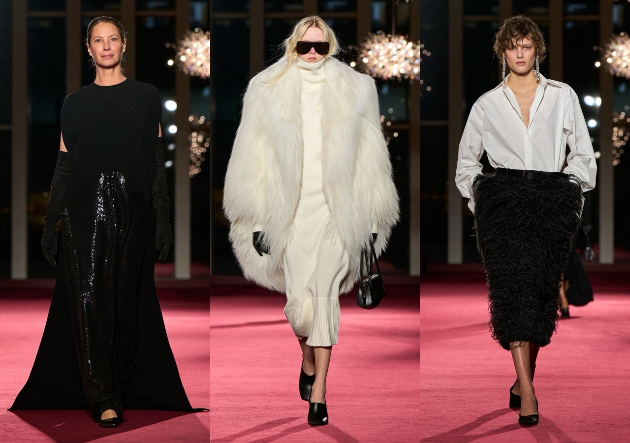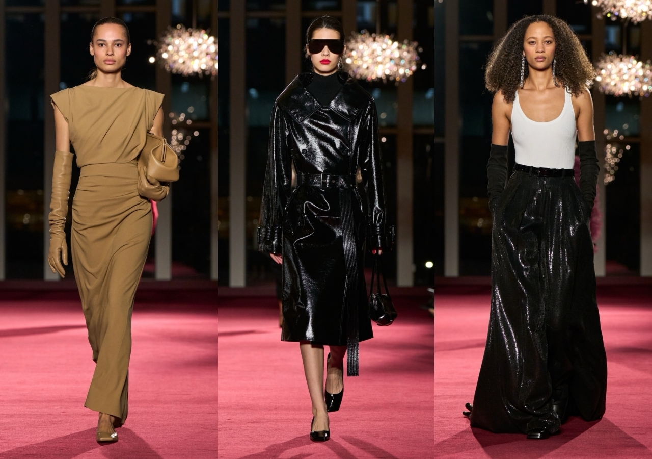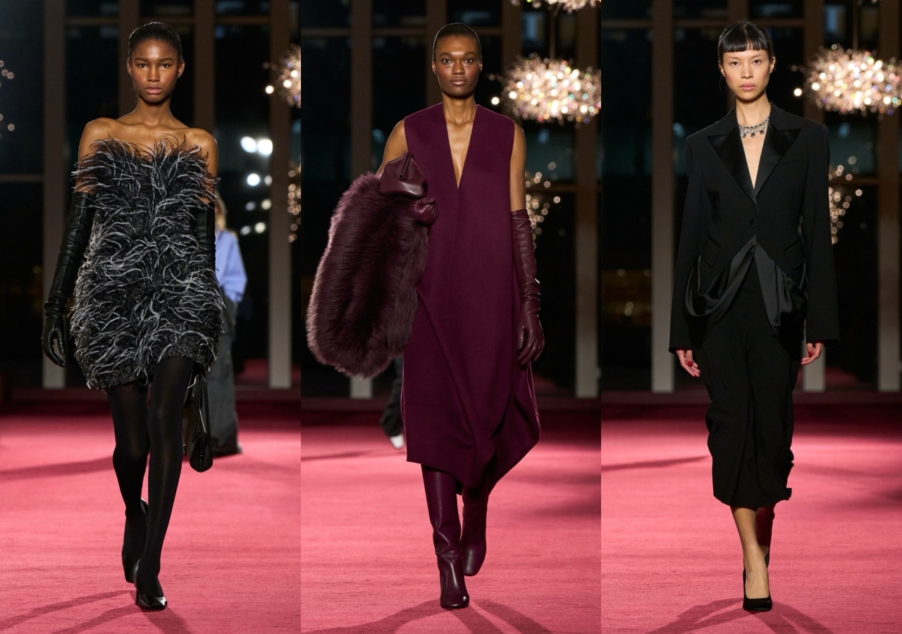 Палитра собирает городские нейтральные оттенки — от фирменного camel, который в тексте показа переименован в «fawn», до оттенков бежевого. На их фоне появляются рубиновые, малиновые и винно-бордовые акценты. Аксессуары поданы с «архитектурной» чёткостью и отсылками к нью-йоркской вертикали; обувь описана как рассчитанная на движение.