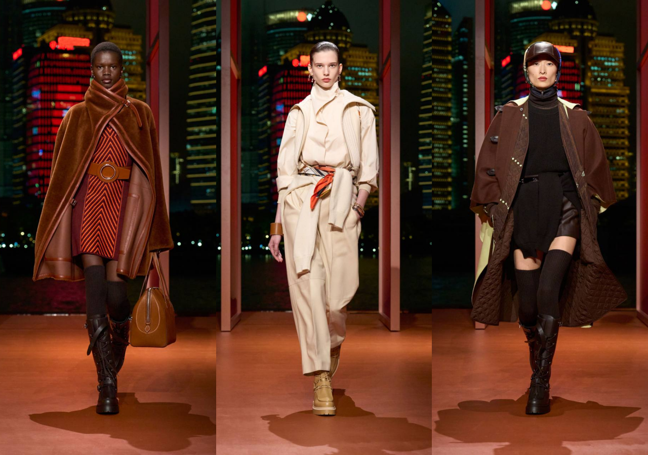 Модный показ Hermès состоялся в Шанхае, на живописной набережной реки Хуанпу, где бренд представил вторую часть своей коллекции осень-зима 2025. Креативный директор Надеж Ване-Цыбульски создала уникальную коллекцию, в которой гармонично соединила парижский шик с духом современного китайского мегаполиса. Урбанистический стиль стал основой коллекции. Подиум представил многослойные образы, отражающие динамичный ритм городской жизни. В центре внимания оказались: Монохромные блузки в сочетании с кожаными юбками и шортами; Свитера, элегантно повязанные на талии; Двусторонние стеганые куртки; Пуховики с изысканными кожаными воротниками; Пальто из премиального двухстороннего кашемира.