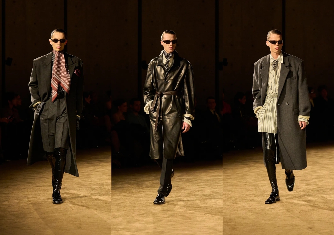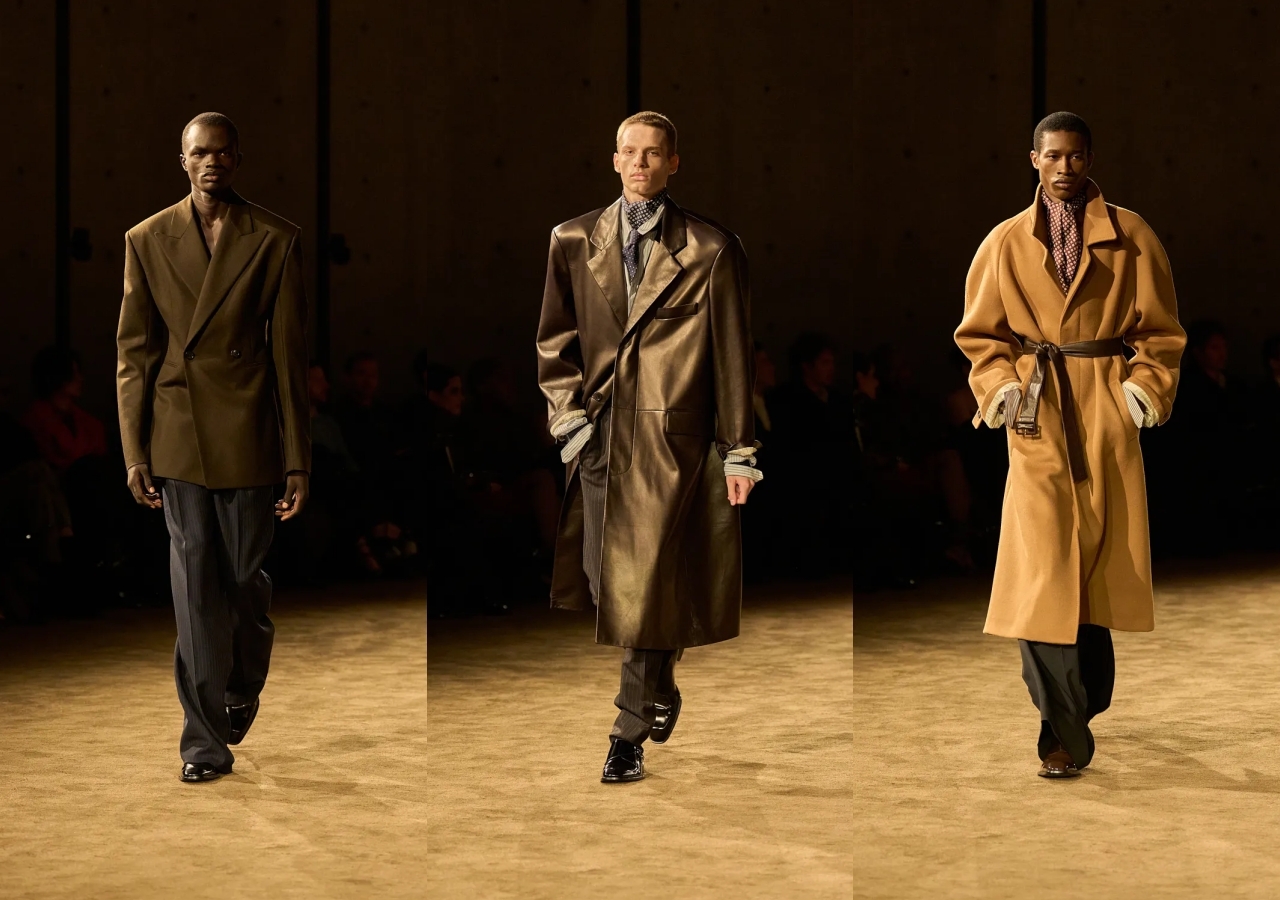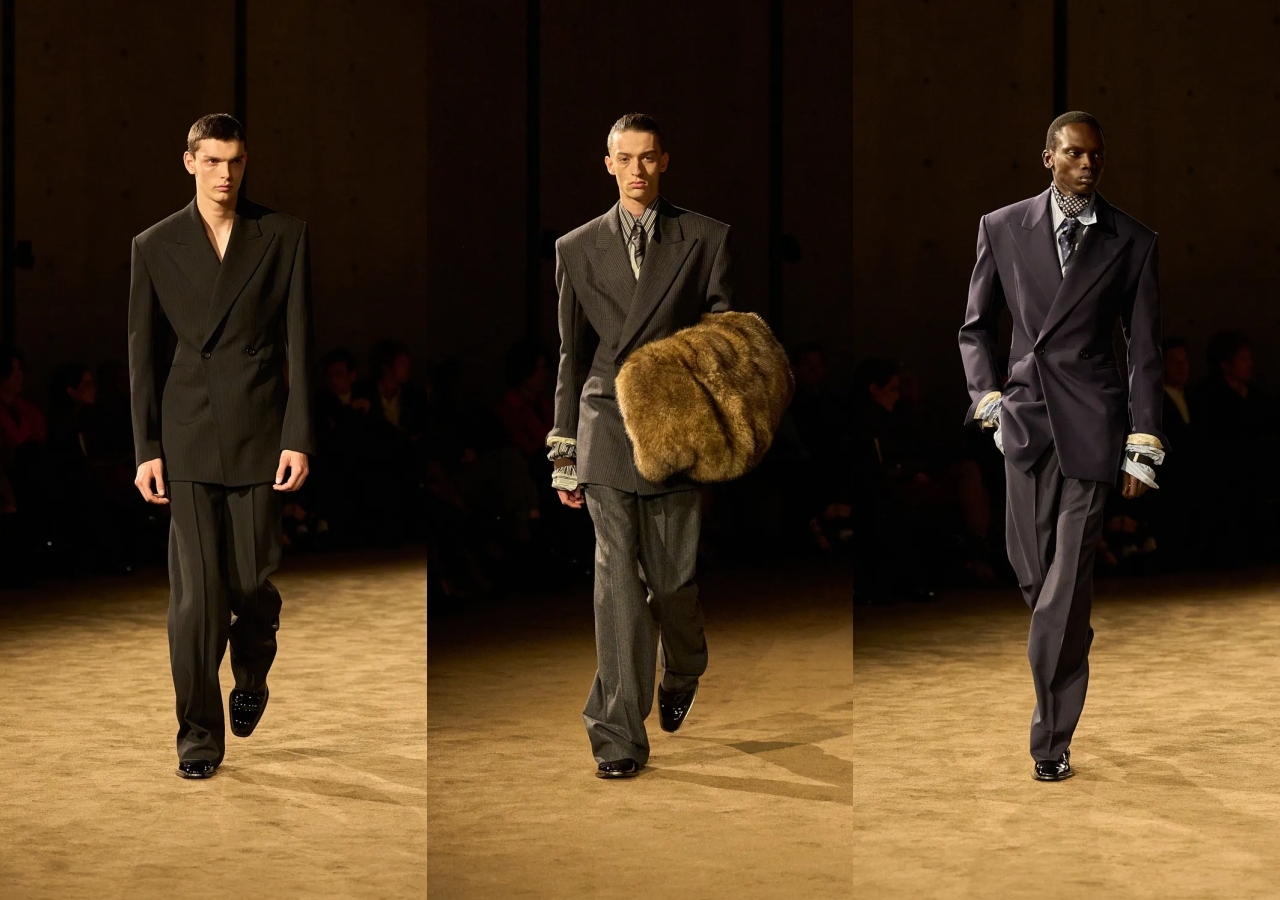 Фирменные жёсткие жакеты, ставшие узнаваемым элементом Энтони Ваккарелло, на этот раз смягчили по бокам: силуэт стал слегка «песочным», но, как уточнил дизайнер, без ухода в женственность и без привычной угловатости, связанной со стереотипным образом маскулинности. Брюки звучали шире по ноге, с заметным шелестом в движении и полноценным заломом над блестящими оксфордами.