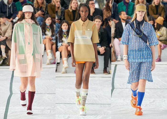 В коллекцию вошли резиновые юбки, трикотажные топы, непромокаемые плащи, пончо, анораки, костюмы с баскетбольными шортами вместо брюк, сетчатые майки.